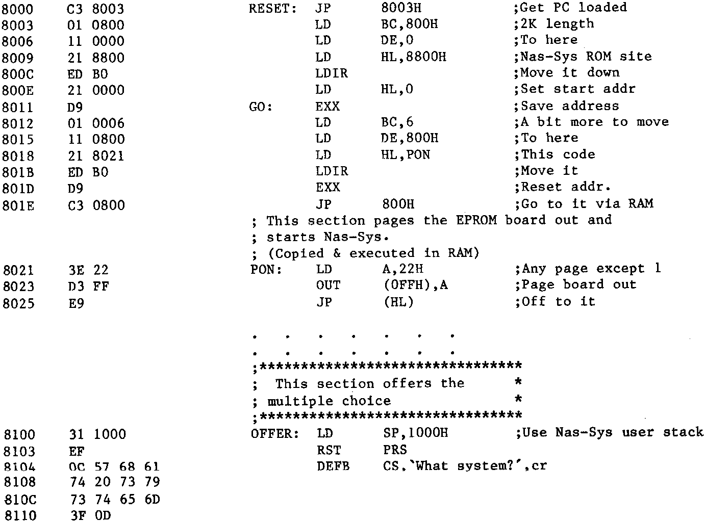 The power-on (or Reset) program is shown below together with parts of the other control program. The purpose of the power-on section is to copy the modified Nas-Sys to RAM at 0, and then to jump to it paging out the EPROM board on the way.(*** Note that we must be off the board before it’s paged out otherwise our program will suddenly vanish as the OUT instruction is executed! ***).