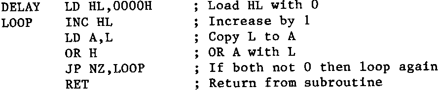 First, notice line 10, I’ve introduced a new assembler directive, ‘ORG’. Now up till now, we haven’t supplied any information as to where the program is going to reside in memory. The origin of the program has not been spelled out. In part 3, the program started at 0D00H, and that’s as good a place as any, so lets declare the origin of the program, ORG 0D00H. (Notice the ‘0’ in front, that’s so the address doesn’t get confused with the label). Notice also that I’ve put an extra carriage return between the declarations at the front and the main routine, and between the main routine and the subroutine. (I was going to say I’d split up into ‘byte size’ chunks, but such appalling puns are beneath even my meagre wit.) Anyway, by separating the program thus, it’s easy to see what each bit is about.