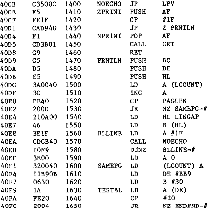 Having loaded ZEAP replace the contents of 18E6 and 18E7 by the address of the new routine ZPRINT. ZPRINT activates the printer by the jump to LPV at line 1400 which prints the character in A. ZPRINT also tests for and ignores trailing blanks and paginates the output.