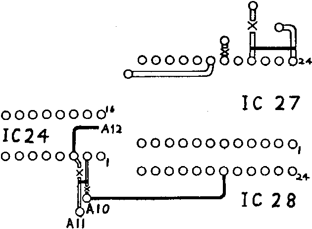 To use 2732 type EPROMs for a total of 16K firmware, cut tracks as above,then cut tracks near p20 for each socket,