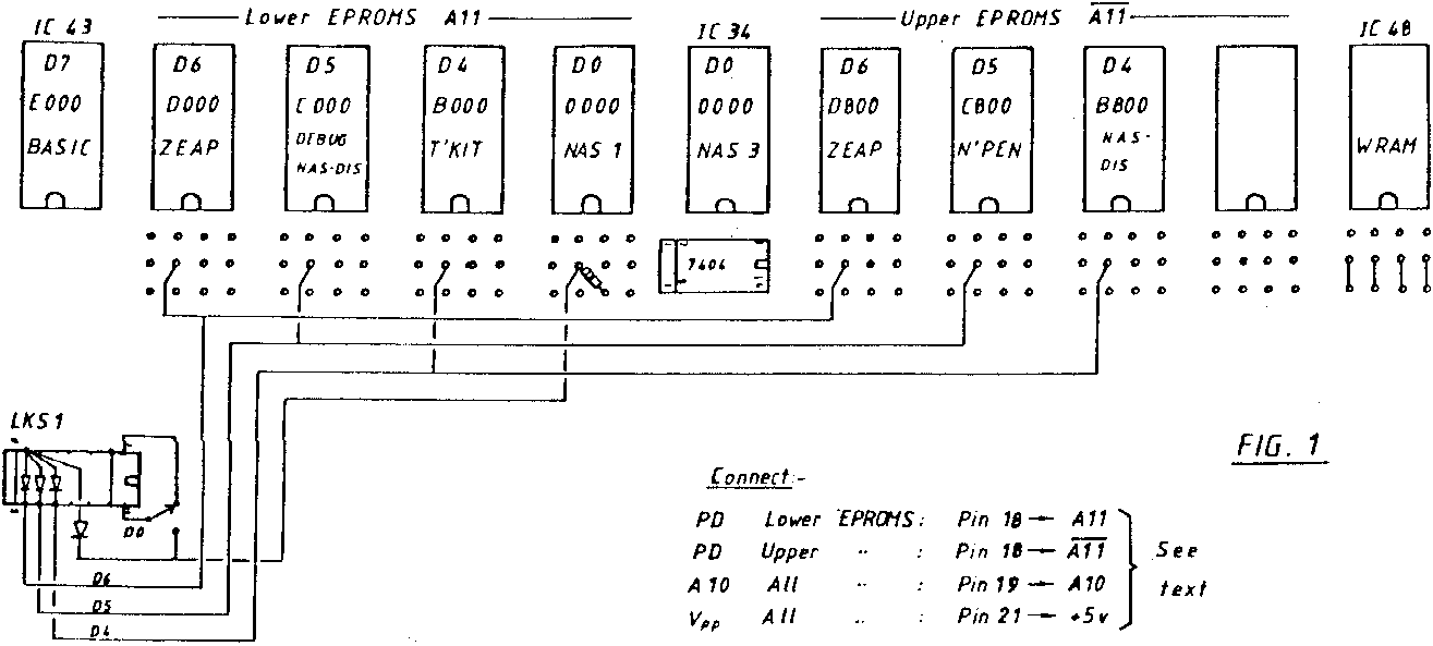 Sometimes it may be required to switch different EPROMS into a given memory location and fig. 1 shows a method of doing this for, in my case, alternative monitors. The appropriate block pulse is switched to the appropriate pin 20 but it is necessary to disable the non used EPROM by allowing its Pin 20 to go high via a 1K resistor to +5v. The 1K for the original monitor is already on board (R53) but must be provided for any non-used EPROM. The gating diode for the switched monitor is also taken to LKS1-7.