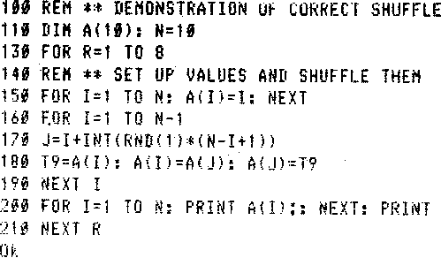 For each item in the list, i, where there are n items (FOR I=1 to N) generate a random integer j in the range 1 to N and swop item i with item j. This method may seem to work but it is incorrect. Some orders are more likely than others. Never use this method.
