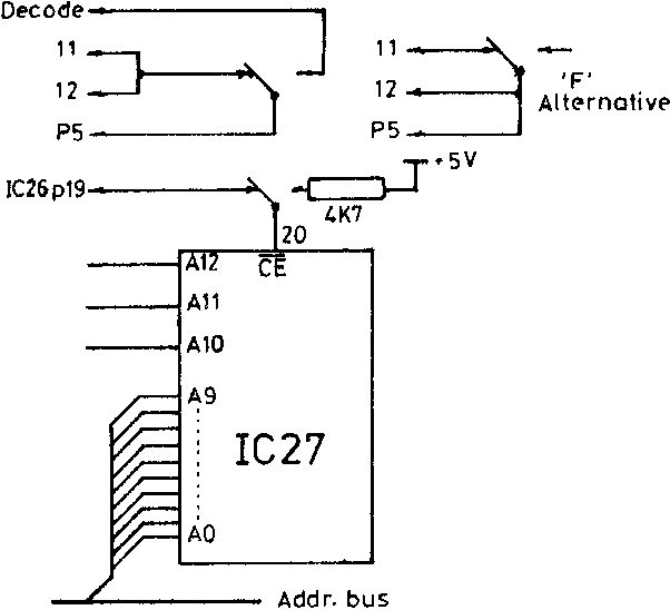 −5 volt supplies to the EPROM sockets so these must be restored to make ICs 28, 29 and 30 operable. Two jumpers from the points where the tracks were cut to pins 19 and 21 on IC28 will restore the juice. But this will also put juice back on IC27, as these pins are linked on the top side of the pcb. Some deft knife work is required to cut these two tracks between ICs 27 and 28 sockets (and get it right ’cos you’ll never repair a mistake!!!). Now the way we have mod’ed the chip select on the Basic ROM means that it will come on regardless, so a switch is called for to disable the ROM when not required. So make it a double pole switch, and use it for