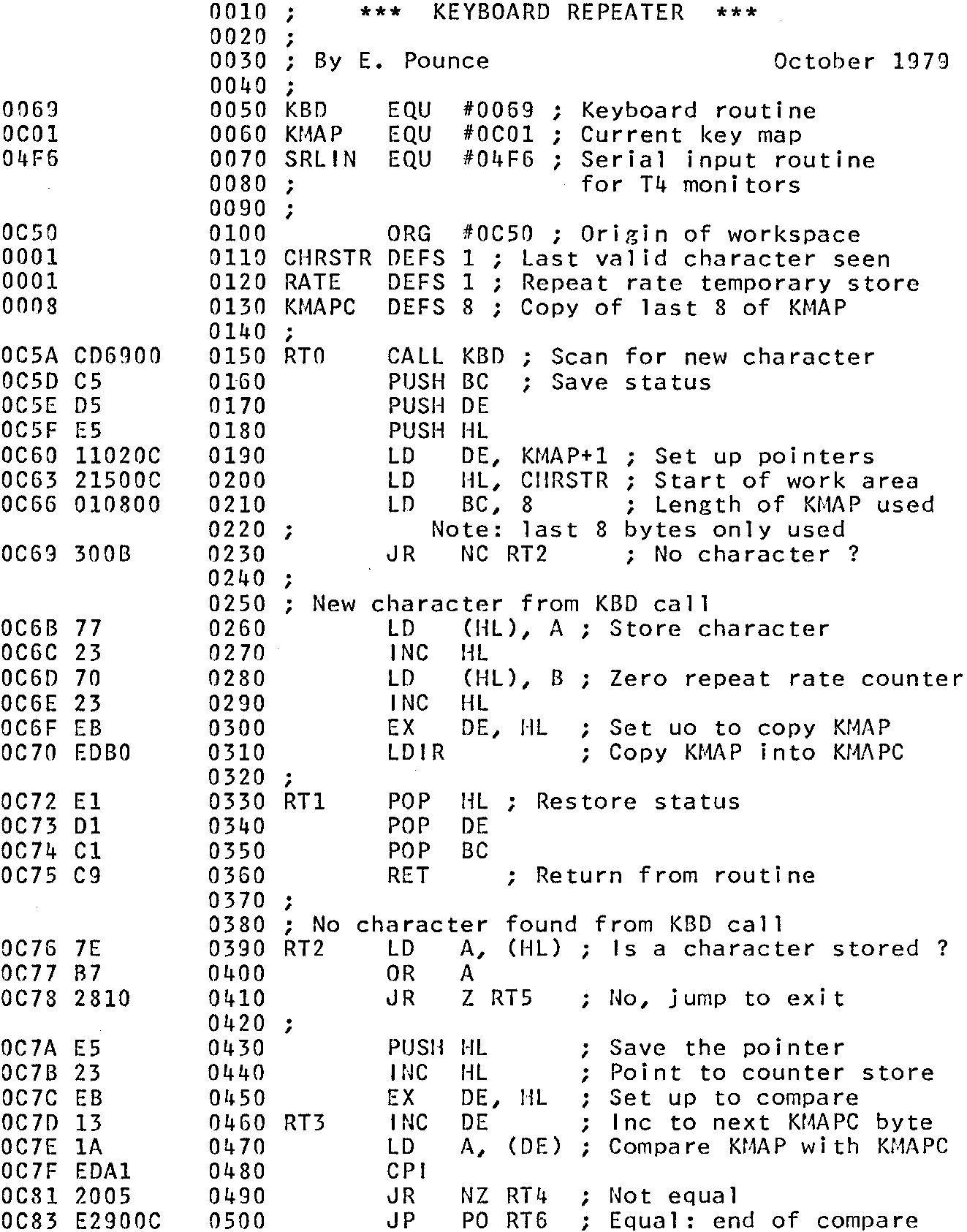 Once this routine has been loaded and the reflective address changed the repeat is available to any program using CHIN. But take care not to corrupt any of the program otherwise no characters can be entered – even monitor commands – and a reset will be required to put the reflective address back to normal.