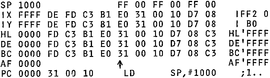 D-BUG uses NAS-SYS editing in an unusual and advanced way. The cursor can be moved up and the lines of display edited, one line at a time. The memory locations pointed at by the registers can be altered, and the values of SP, IX, IY, HL, DE, BC, AF, and PC can also be altered. If the code after PC is altered, the disassembled source code appears at once. The values of IFF2, I, and the alternate registers cannot be directly altered in this way. A character representation of the flags is output when the flags are set, and these can be altered by editing the F register.