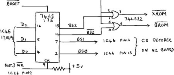 The bank control board is shown in figure 1. The 74LS175 latch is a three bit output port, strobed by the inverted PORT 3 WR signal from the I/O decode PROM IC26. Latched data bits BS0 and BS1 are connected to pins 13 and 3 of the chip select decoder IC46, to select one-of-four EPROM banks. These two IC pins