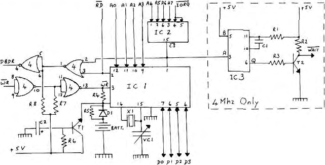 If the unit has been built according to the circuit diagram you will find that it is addressable at ports 64 to 79 (don’t forget to switch to external port addressing). I enclose 2 demonstration programs written in Microsoft 80. The first is called to initialise the clock. Lines 100-190 input the date and time, and control the validity. Line 230 sets all bits of register 14 to 0 thus stopping the clock. Lines 220-380 set up the date and time in registers R4-R13. Note, I don’t use register 10, day of the week. Lines 330-370 set up the correct value for the Leap year. Note, the astuce for detecting the year on a 0 to 3 basis in line 330.