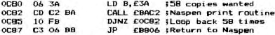 To use, just enter this code having set the second byte for the number of copies in hex (up to 255 of FF hex) and execute at the address loaded. Ensure that when you exit from Naspen you leave the cursor pointing at the first character to be printed or use the ‘Z’ command before leaving if you want the whole text file printing. As the loop executes, you will see ‘completed’ printed on the screen after every copy. This because it is within the print routine in Naspen and before the RETurn command.