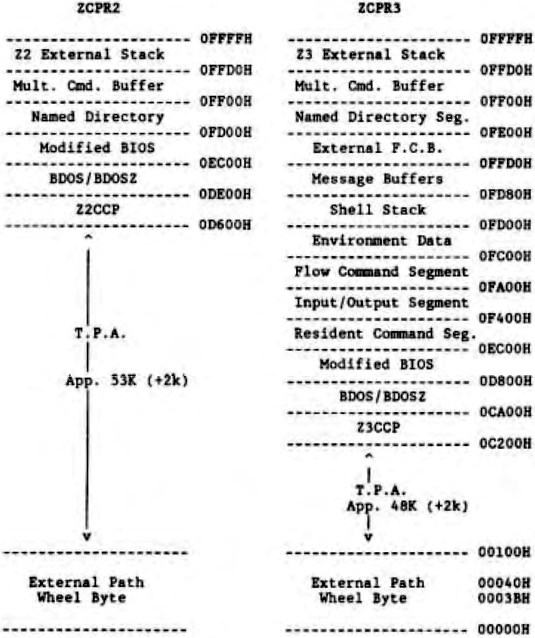 Z3 is upward compatible with Z2, and so comments from here on will generally relate to Z3. The three memory extensions above CP/M with Z2 are the same as with Z3. There is one major difference which concerns the named directory facility. The Named Directory segment of Z2 is 200H bytes long, whereas that with Z3 is only 100M bytes long, (but could be made larger), and deals with 14 names. In practice this seems adequate. Also Z2 itself is not able to use or recognize the names, whereas the Z2 utilities can. This seemed to me to be a major deficiency of Z2, on a Winchester based system. On a Floppy based system, where the media is continually changing, names are perhaps of limited use. especially on systems where the disks are under say 500k. (Although the system allows the directory segment to be easily changed, and so a new one could be loaded for each application.)