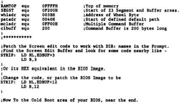 The Warm Boot Jump must be found. The code below assumes your BIOS has the Cold Boot routines in the BIOS workspace area, where they will be overlaid when the system is running. The Warm Boot routines are usually located near the start of the BIOS. Examine the First two jumps in the jump table at the start of the BIOS (normally 17 jump instructions) to get the Cold and Warm boot routine start Addresses. Note that the jump to WBOOT1 found near the end of the cold boot routines as shown below will probably not be to the start of the Warm boot routines as found from the second jump table address, but some tens of bytes into the Warm boot routines.