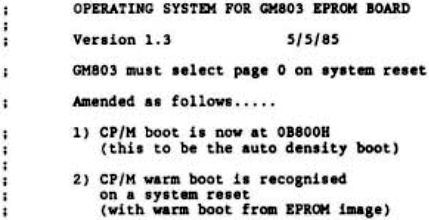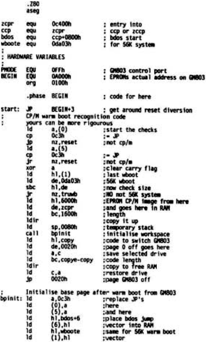 If the jump instructions are present, the system size is checked to determine whether warm boot should be off ROM (standard system) or disk (non-standard system). In each case a small piece of code, to turn off the ROM board and jump to the correct entry point, is copied to an area of free RAM (0020h) and executed.