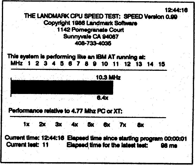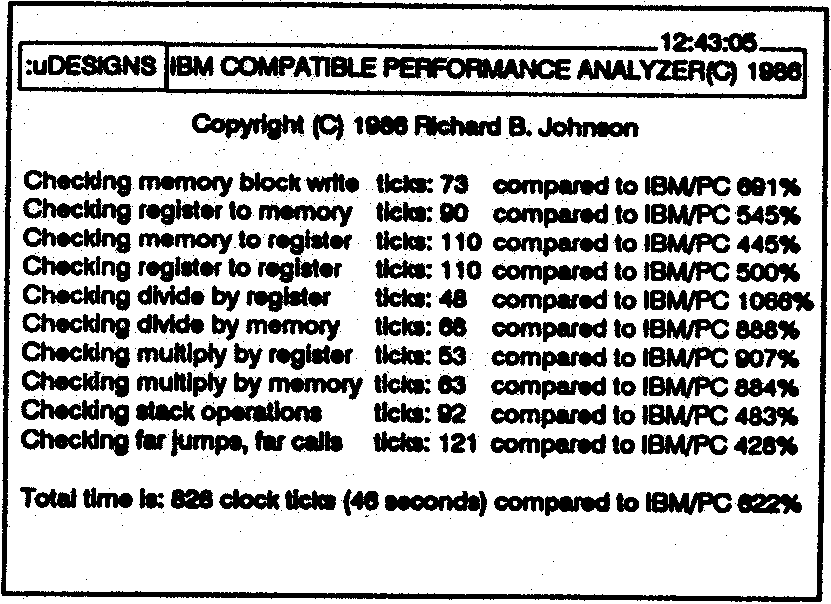 Perhaps the most universally used is Peter Norton’s SI (System Information) program which sits and chugs for a moment or two and finally spits out a ‘goodness’ number relative to a bog standard IBM PC at 4.77 MHz. A 6MHz IBM AT with one wait state clocks in at about 8.5, my toy shows up at 11.5 and so on. The latest version of SI goes on to test the relative goodness of the hard disk as well (which can be very revealing).