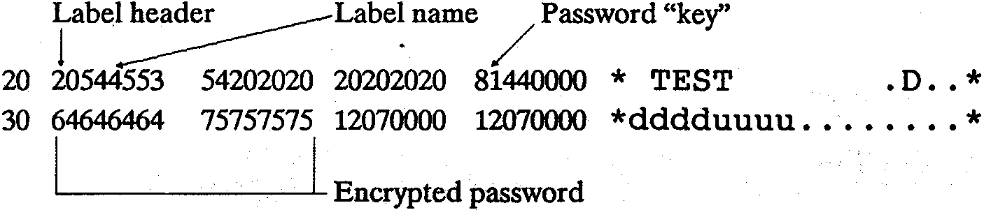 A label directory entry has the first byte as 20H, rather than the normal 00H or user number. The password is encrypted in the area normally occupied by the block information as shown below.