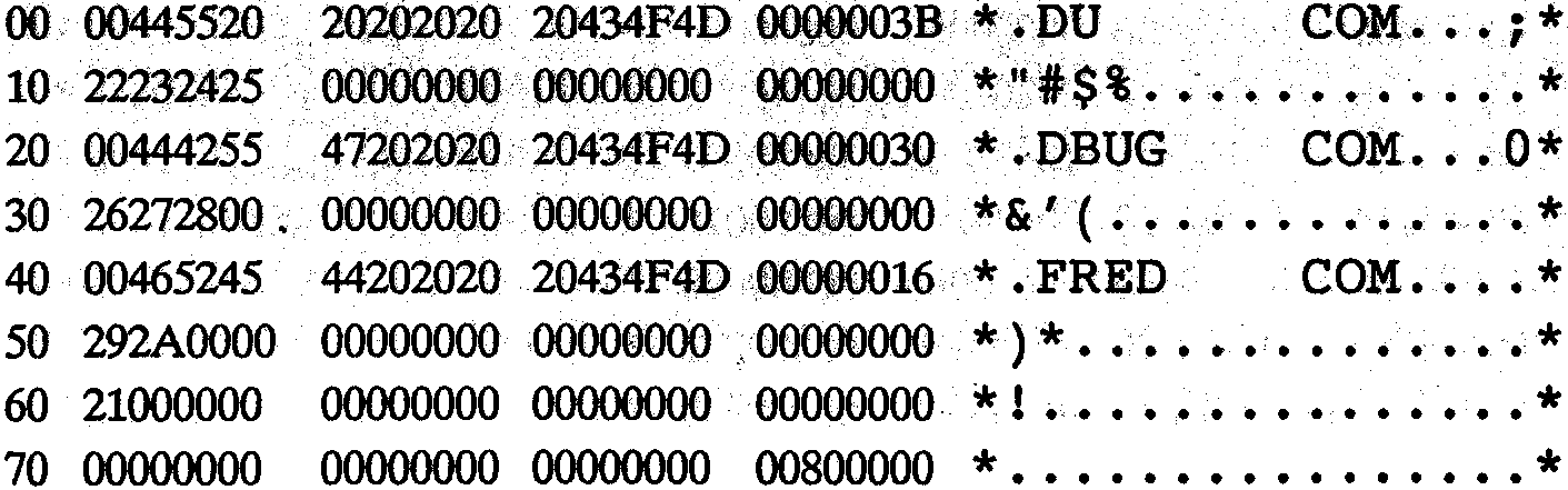 The main directory entry for FRED.COM is unaltered, but the CCP must scan the rest of the directory to find if an entry has the extent 10H. An example is is shown below: